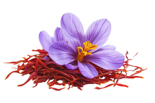 Bright purple saffron flower atop vibrant red saffron threads showcasing the beauty and uniqueness of this rare spice sourced from the flower's stigmas