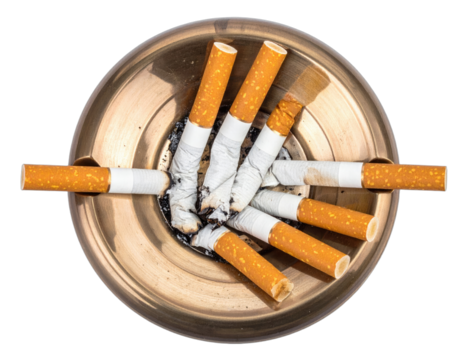 Close-up of a brass ashtray overflowing with extinguished and unlit cigarettes