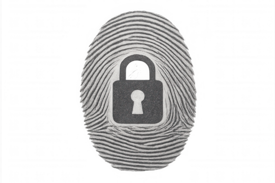 Fingerprint featuring a lock icon symbolizing biometric authentication, data security, personal privacy, and access control. Transparent background