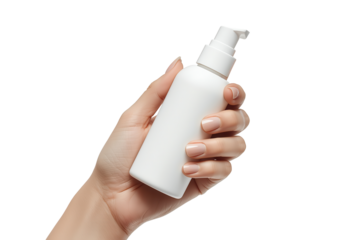 A hand gracefully holds a white, unmarked dispenser against a transparent background