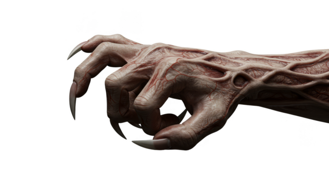 Elongated monstrous hand with sharp claws and bloody vine transparent background monster