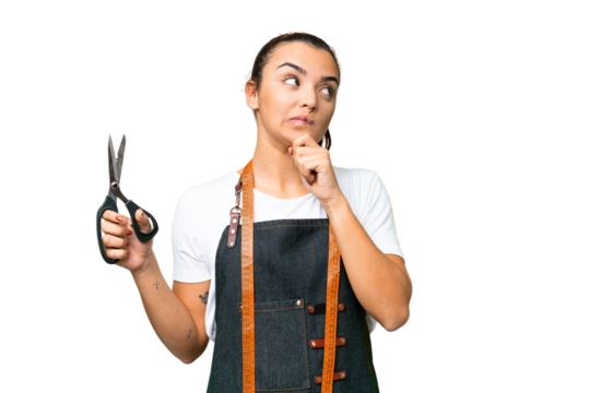 Doubtful young Asian man in casual shirt holding smartphone, looking aside at free space, thinking about something isolated on transparent background