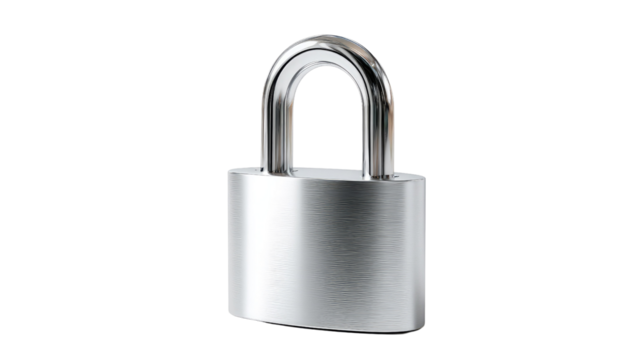 Secure and Sleek: An up-close shot of a sturdy, metallic padlock symbolizes security and protection, capturing a minimalist aesthetic and robust design.
