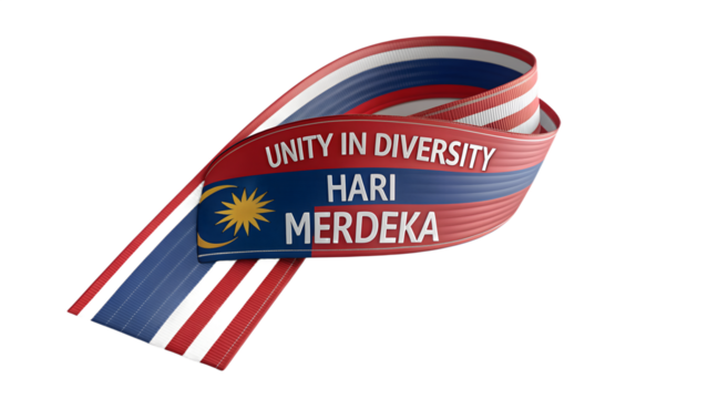 Unity in diversity hari merdeka text with malaysian flag and ribbon isolated on transparent background