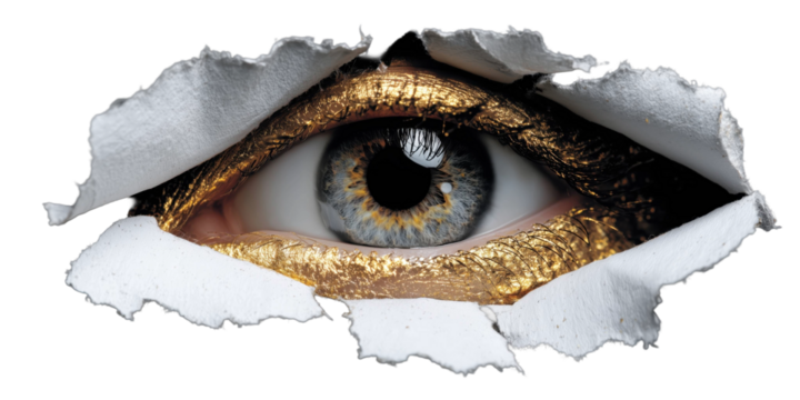 Intriguing Gaze: A captivating eye, with striking golden accents, peeks through a torn surface, hinting at discovery and perception.