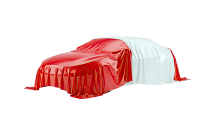 Red car covered with cloth isolated PNG on transparent background, mystery vehicle reveal concept for marketing and advertising