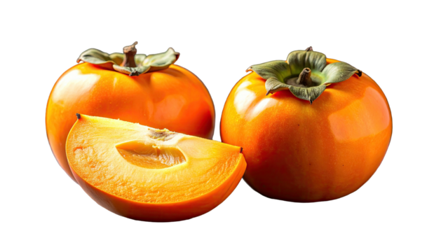 Three ripe persimmons, one sliced to reveal flesh, against a dark void