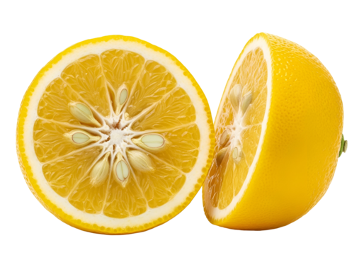 Two vibrant yellow lemon halves, sliced to reveal a starburst pattern of seeds, against a striking black background.