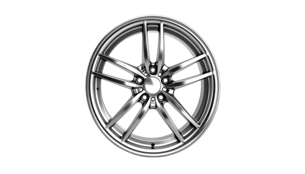 Glossy, metallic car wheel with multiple spokes on a pitch-black background