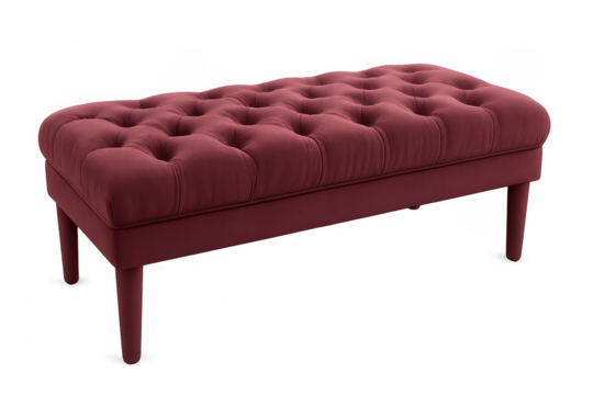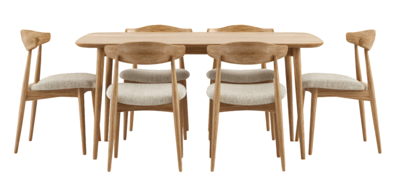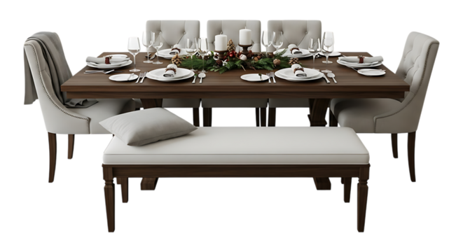 Elegant dining room set with upholstered chairs and bench isolated on transparent background