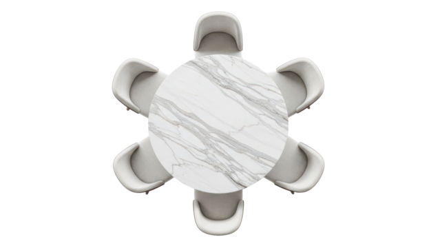 Top view composition of a round marble dining table with matching upholstered dining chairs isolated on white background