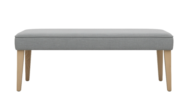 A modern upholstered dining bench in gray fabric with wooden legs.