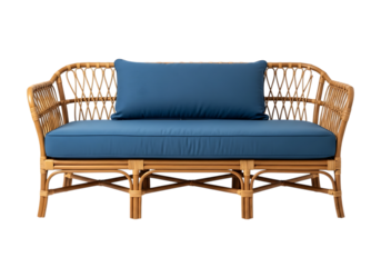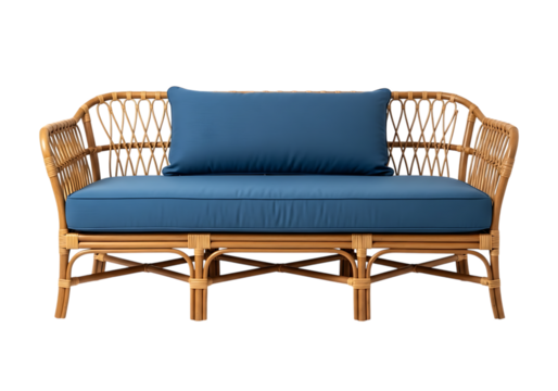 Modern Wicker Rattan Outdoor Sofa with Large Blue Upholstered Cushion, Stylish Patio Furniture for Garden and Terrace Isolated on White