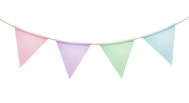 Triangular watercolor bunting flags in soft pastel pink, lavender, mint, and blue, strung on a line, against a white background with copy space, concept of festive cheer