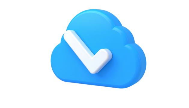 3D render of a stylized blue cloud icon with a white checkmark, against a black background