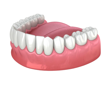 full set of upper and lower dentures on transparent background. Detailed dental prosthesis showing gum and tooth anatomy. Perfect for medical, dental, and educational use, clipping path