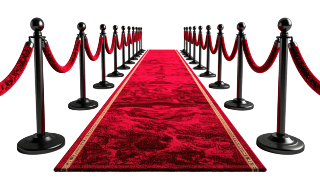 Red velvet ropes with chrome poles, spaced apart, against a black background