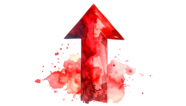 Red upward arrow with watercolor effect, surrounded by splatters, against black background