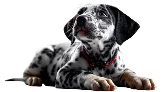 Dalmatian puppy sitting on two back legs in side profile, full body view with tail and ears visible, looking slightly upward, isolated on pure white background