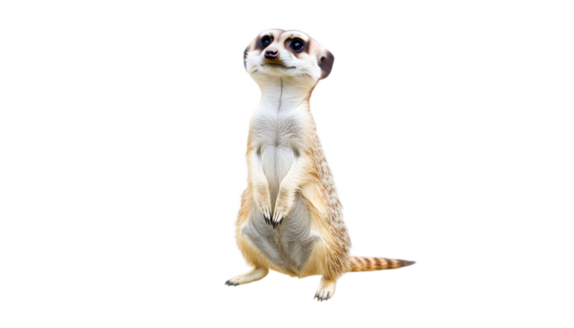 A meerkat stands upright on a white background, looking upwards with its paws held close to its chest.
