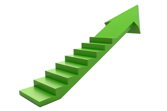 Ascending to Success: A vibrant green staircase morphs into a dynamic arrow, symbolizing progress, growth, and the upward trajectory towards success.
