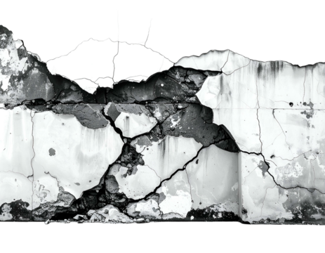 Cracked concrete wall with visible damage and debris showcasing urban decay, isolated on white background