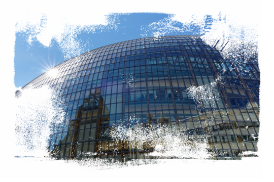 Smiling woman with green backpack and steampunk frame transparent urban style
