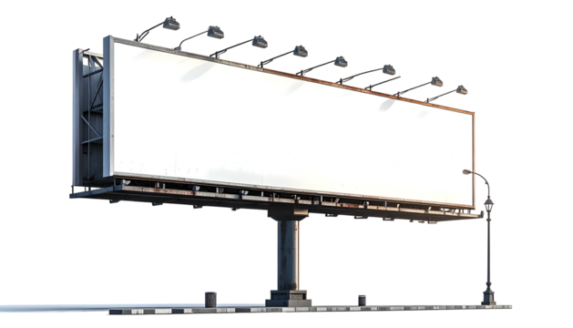 Blank white billboard on tall metal pole, isolated high-resolution PNG cutout with transparent background feel, clean outdoor advertising mockup template with copy space, freestanding signage