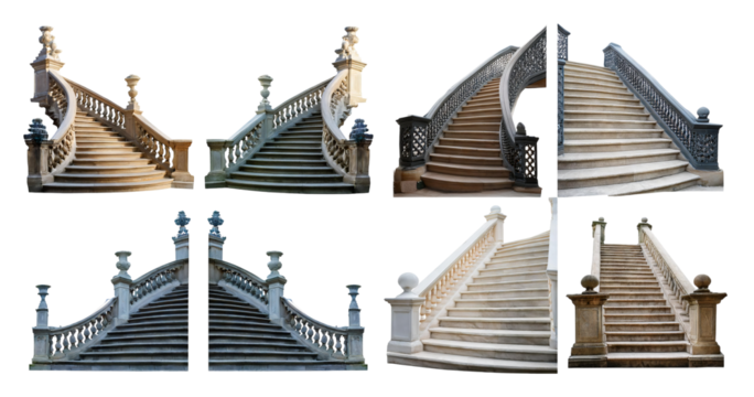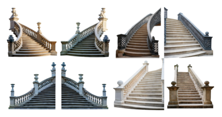 Elegant Curved Staircases with Decorative Handrails and Balustrades, isolated on transparent background