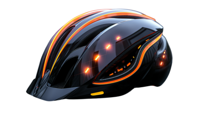 Futuristic black smart cycling helmet with orange LED lights and safety features. Ideal for urban commuting, sports, and wearable tech concepts. marketing use.  Isolated on transparent background, png