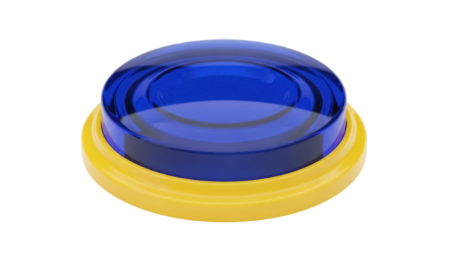 Blue and yellow round button isolated PNG on transparent background, colorful plastic push button for toy or game design
