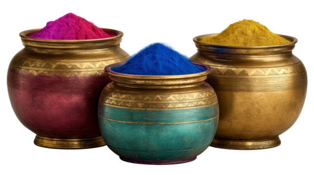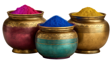 Four ornate brown and gold decorative urns with detailed patterns isolated on a transparent background