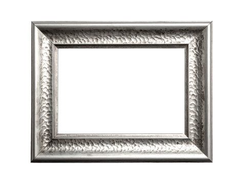 An empty ornate silver picture frame, textured with dark shadowing against a black background