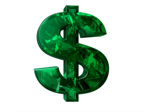 Floating Emerald Dollar Sign with Faceted Gem Texture, Tilted Top-Down View, Black Shadow, Isolated