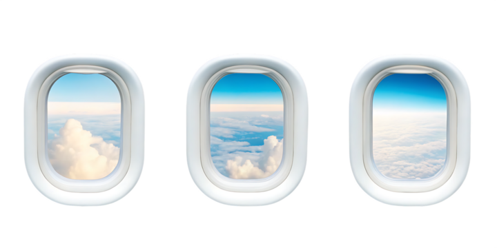 Various airplane window views showcasing clouds and blue skies, perfect for travel and aviation themes. isolated on a transparent background,PNG