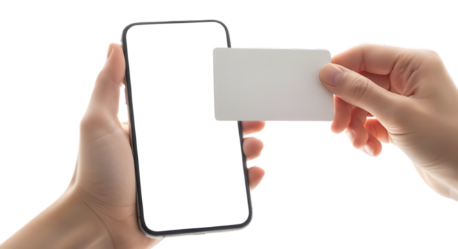Hand holding blank smartphone screen for digital interface design isolated on transparent background