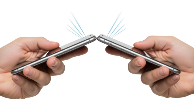 Two hands holding smartphones colliding with each other in mid-air, showcasing technology interaction in a dynamic scene from a straight-on viewpoint