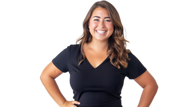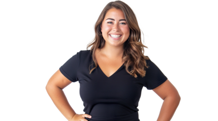 A Front View of a Smiling Woman with Her Hand on Her on Transparent Background, PNG
