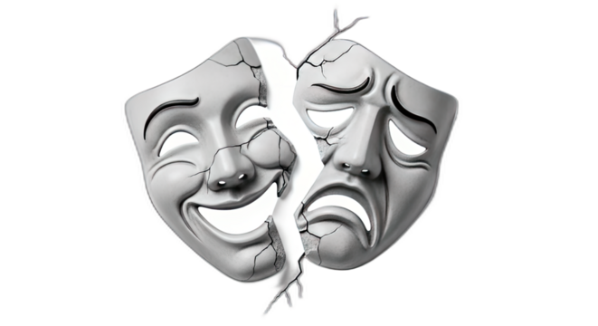A cracked mask showing a happy face and a sad face on a transparent background digital art