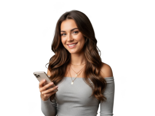 A young woman with curly brown hair smiling while looking at her smartphone, isolated on transparent background