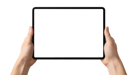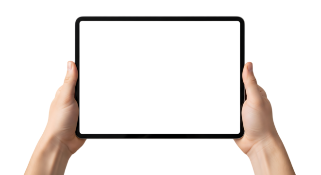 Hands holding a tablet computer with a blank screen, isolated on transparent background
