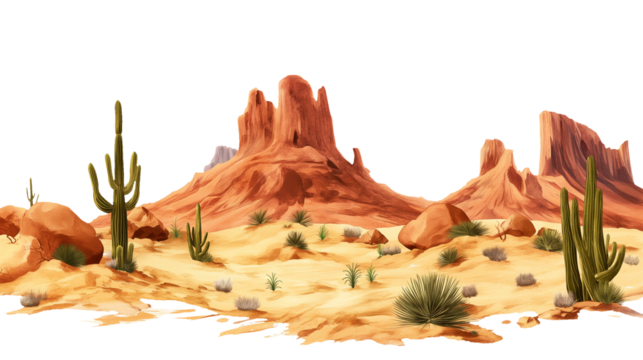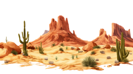 A panoramic desert mountain range at golden hour sunrise or sunset. Isolated on transparent background, png