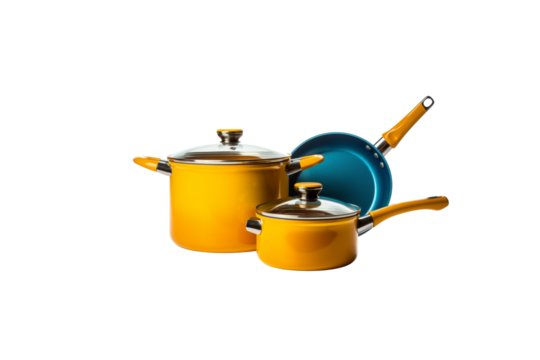 A set of yellow pots and a blue frying pan, ideal for cooking various dishes. background removed