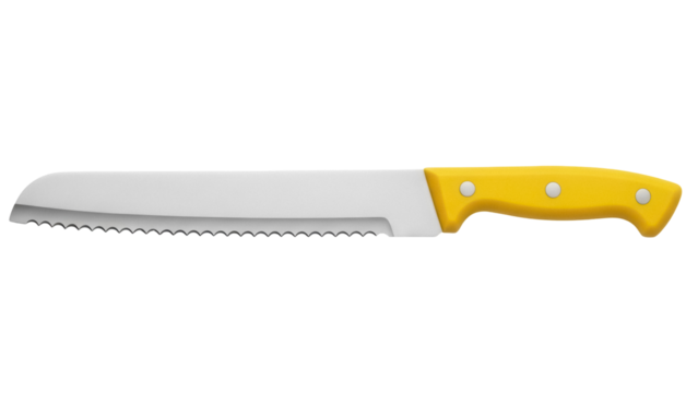 Serrated bread knife with yellow handle isolated PNG, kitchen utensil for slicing bread on transparent background