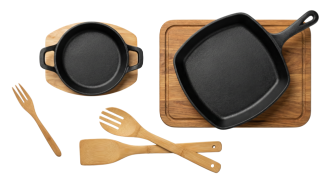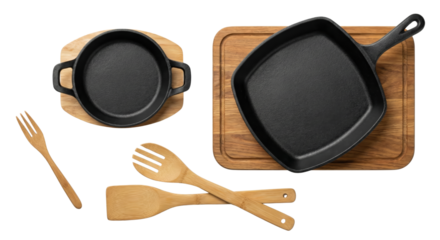 Cast iron pans and wooden kitchen utensils on cutting boards, isolated on white