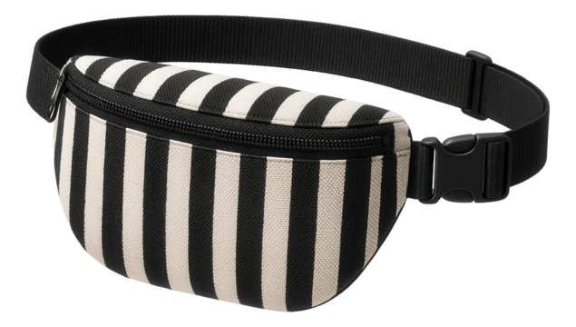 Black and white striped belt bag with a plastic buckle and adjustable waistband