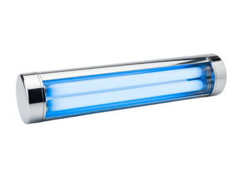 A chrome-finished, cylindrical ultraviolet light fixture is highlighted against a pure black background.