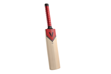 Cricket bat, with a red grip and red and black chevron design, cutout, PNG isolated on white or transparent background