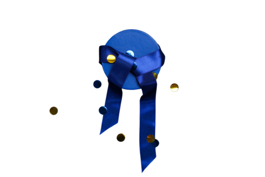 PNG, Mystery box, black with blue bow, isolated on white background.