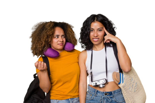 Two diverse friends on a beach vacation with vintage camera, beach bag, and travel pillow showing a disappointment gesture with forefinger.